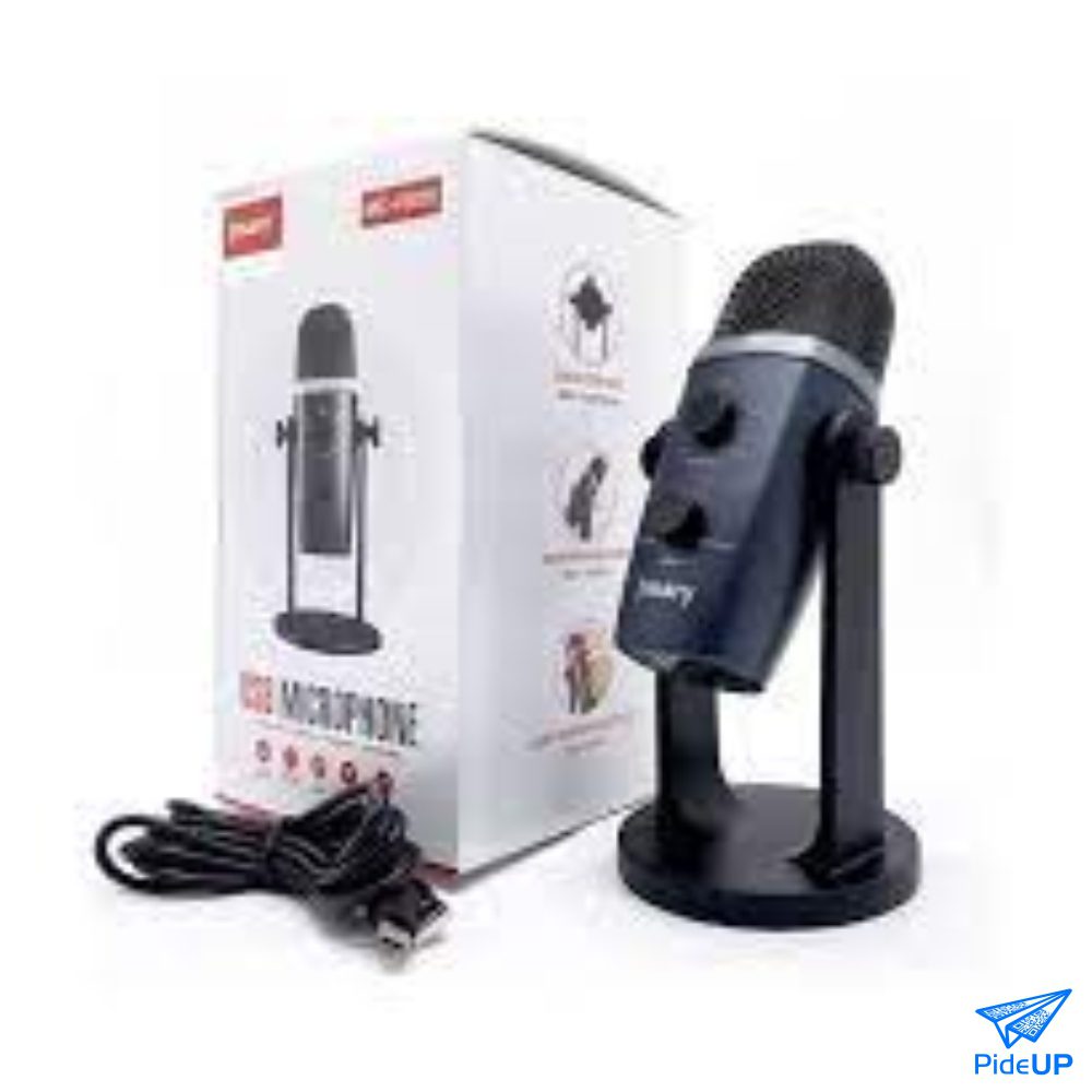 Micrófono USB profesional con 4 modos de sonido, patrón cardioide, control de ganancia, botón mute y monitorización sin latencia.
