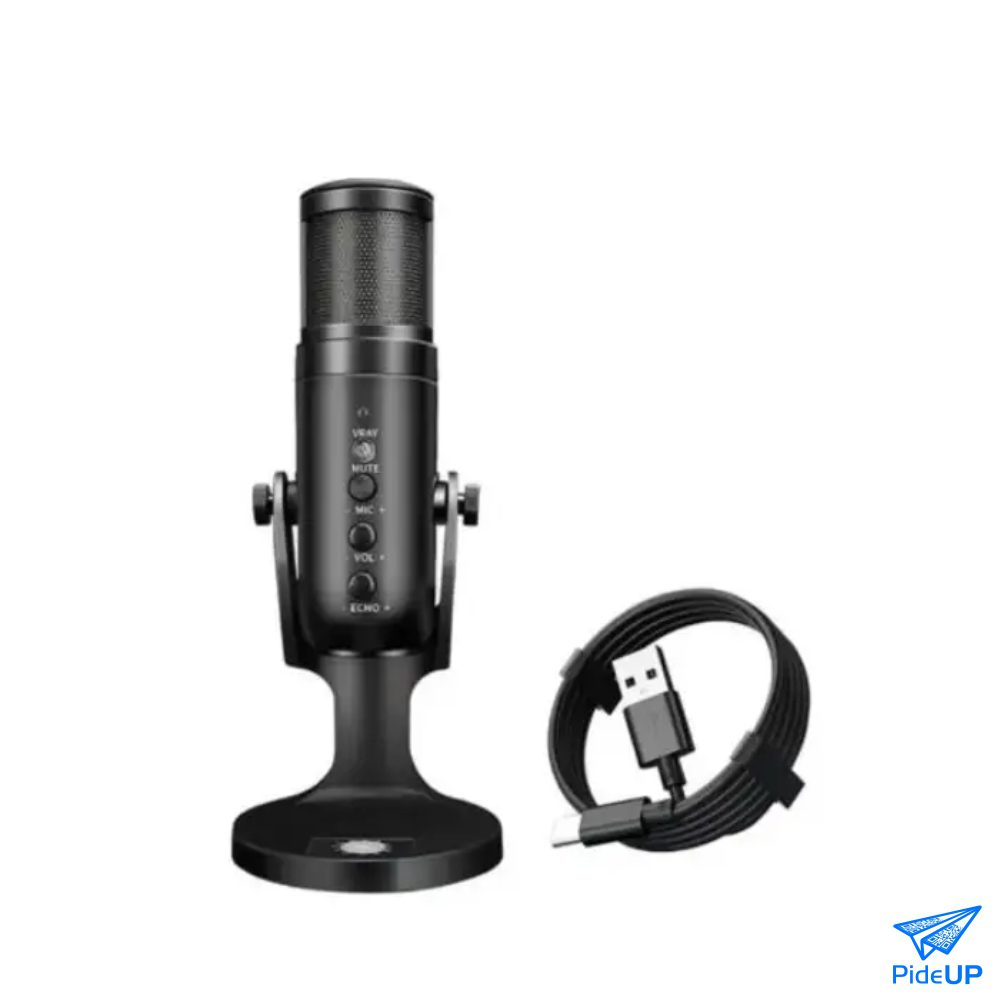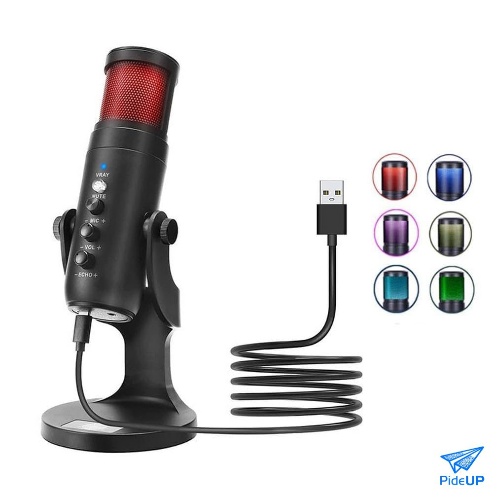 Micrófono USB profesional con patrón cardioide, RGB, ganancia y mute con LED. Plug‑&‑play, con filtro anti‑pop y monitorización en tiempo real.