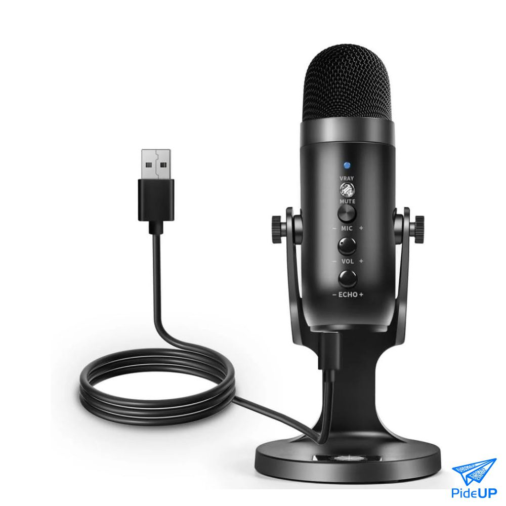 Micrófono USB plug‑and‑play con patrón cardioide, control de ganancia, botón mute, monitorización en tiempo real y filtro anti‑pop para grabaciones limpias.